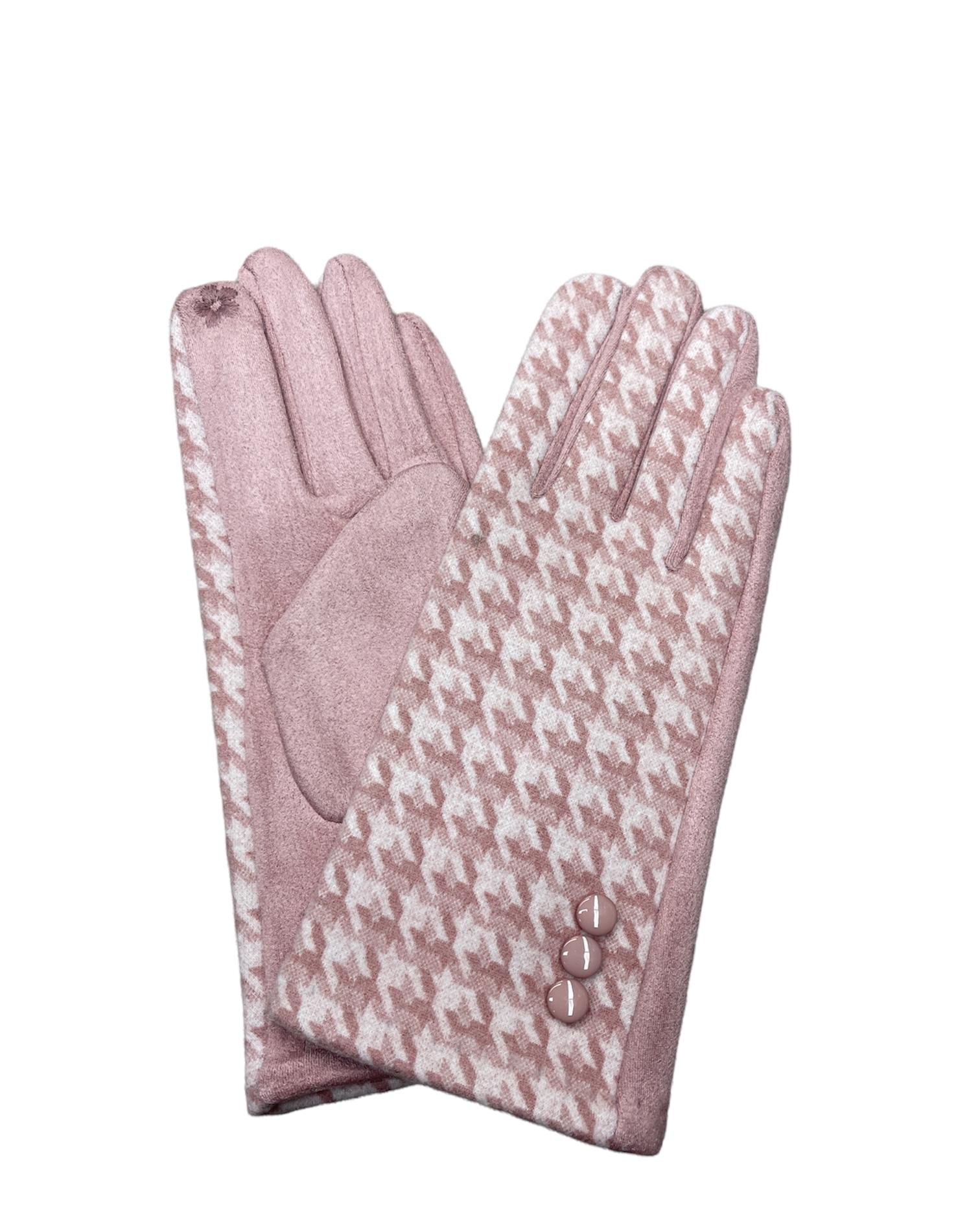 På pekfingret och tummens topp är det en sydd liten blomma i ton-i-ton som gör att de kan användas på mobilskärm.