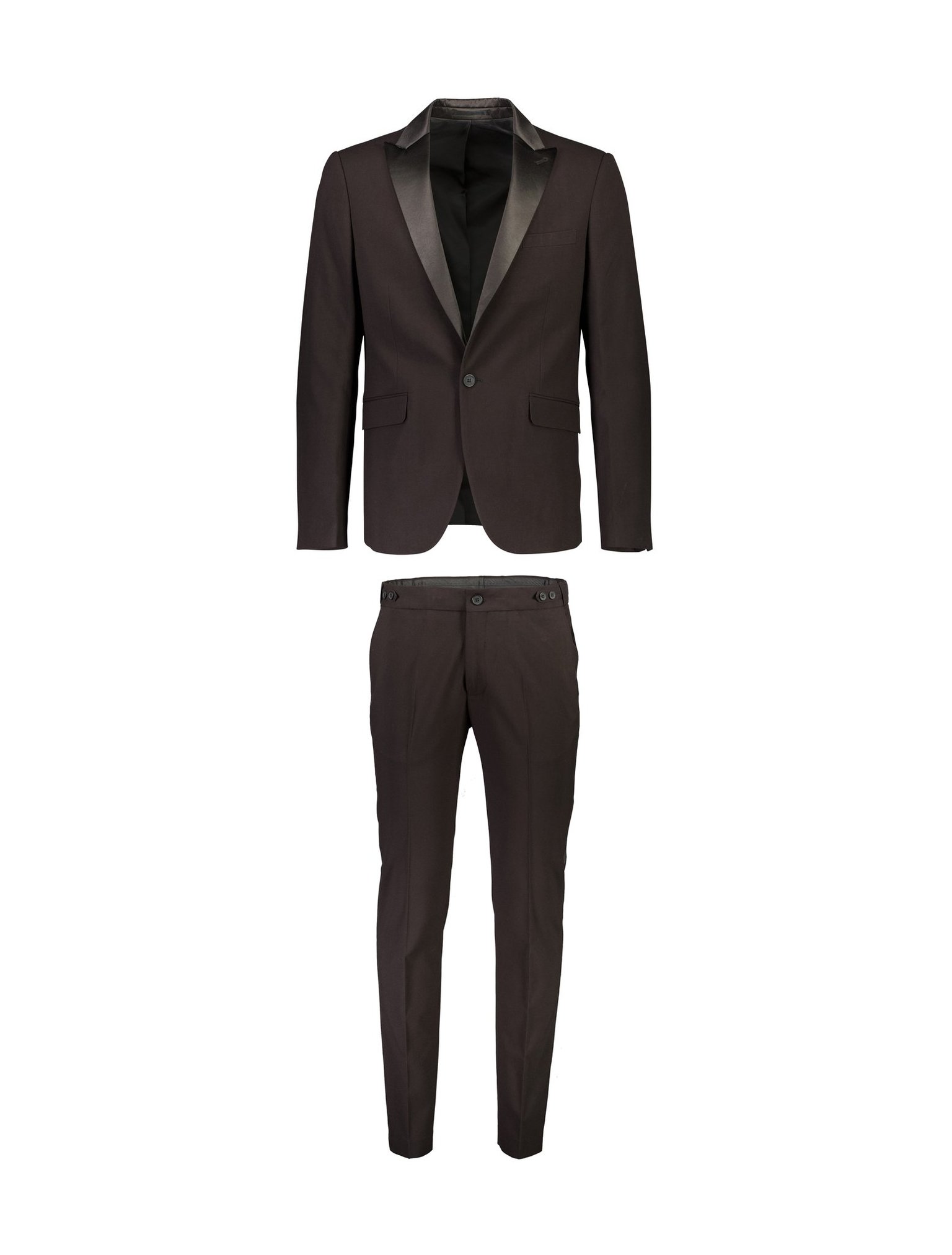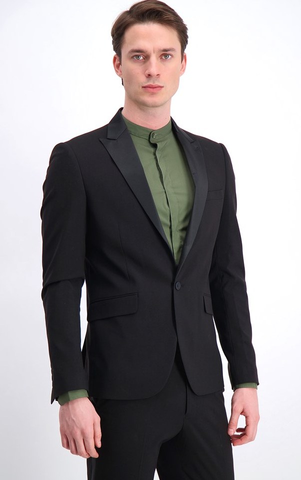 Modellen har klassiska smokingdetaljer men med en trendigare twist. Den har det blanka på slagen och rundad upp runt nacken men upptill fram är det spetsiga slag istället för sjalkrage. Modellen knäpps med en knapp istället för med två men det är en vanlig knapp istället för en blank knapp. Byxorna har klassisk revär i blankt material på benets utsida.