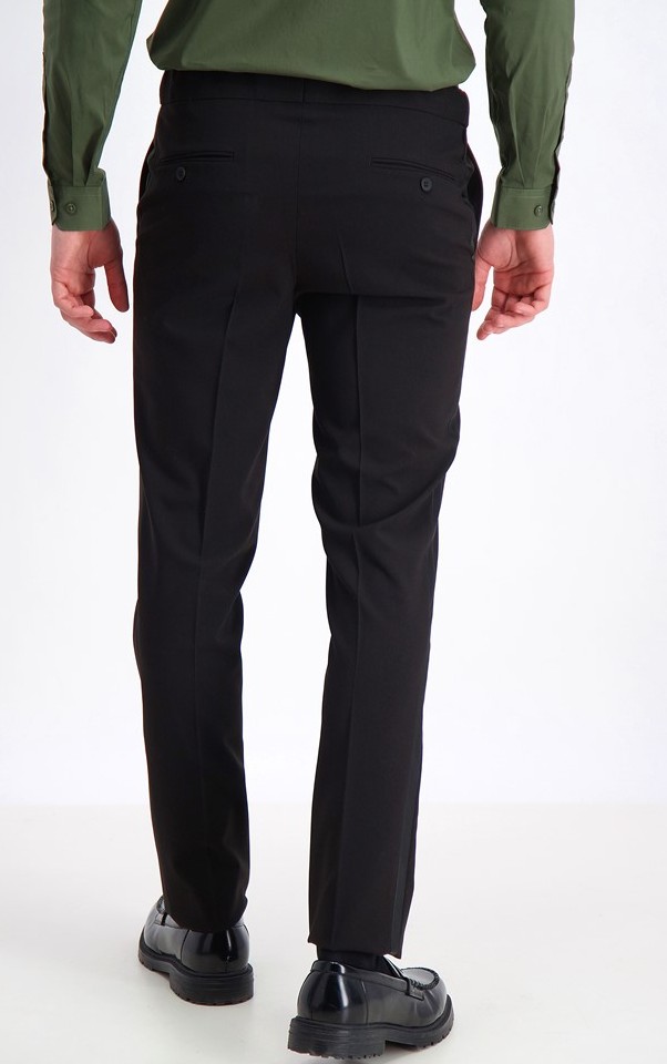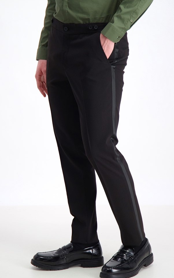 Byxan är gjord med sömsmån i midjan så att man hos skräddaren kan göra den ca 4cm större eller mindre i midjan. Dessutom har byxan två knappar på sidorna framtill där man kan justera midjans vidd ett par centimeter. Modellen har inga hällor eftersom man som standard inte använder bälte till smoking utan i så fall hängslen. Nedtill är det snyggt uppvikt och sydd kant med sömsmån så att den kan göras ca 3cm längre och kan kortas efter önskemål.