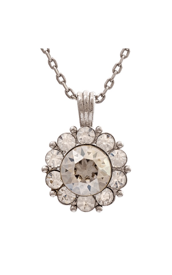 Detta smycke erbjuder en större, slipad kristall i mitten omgiven av mindre kristaller.