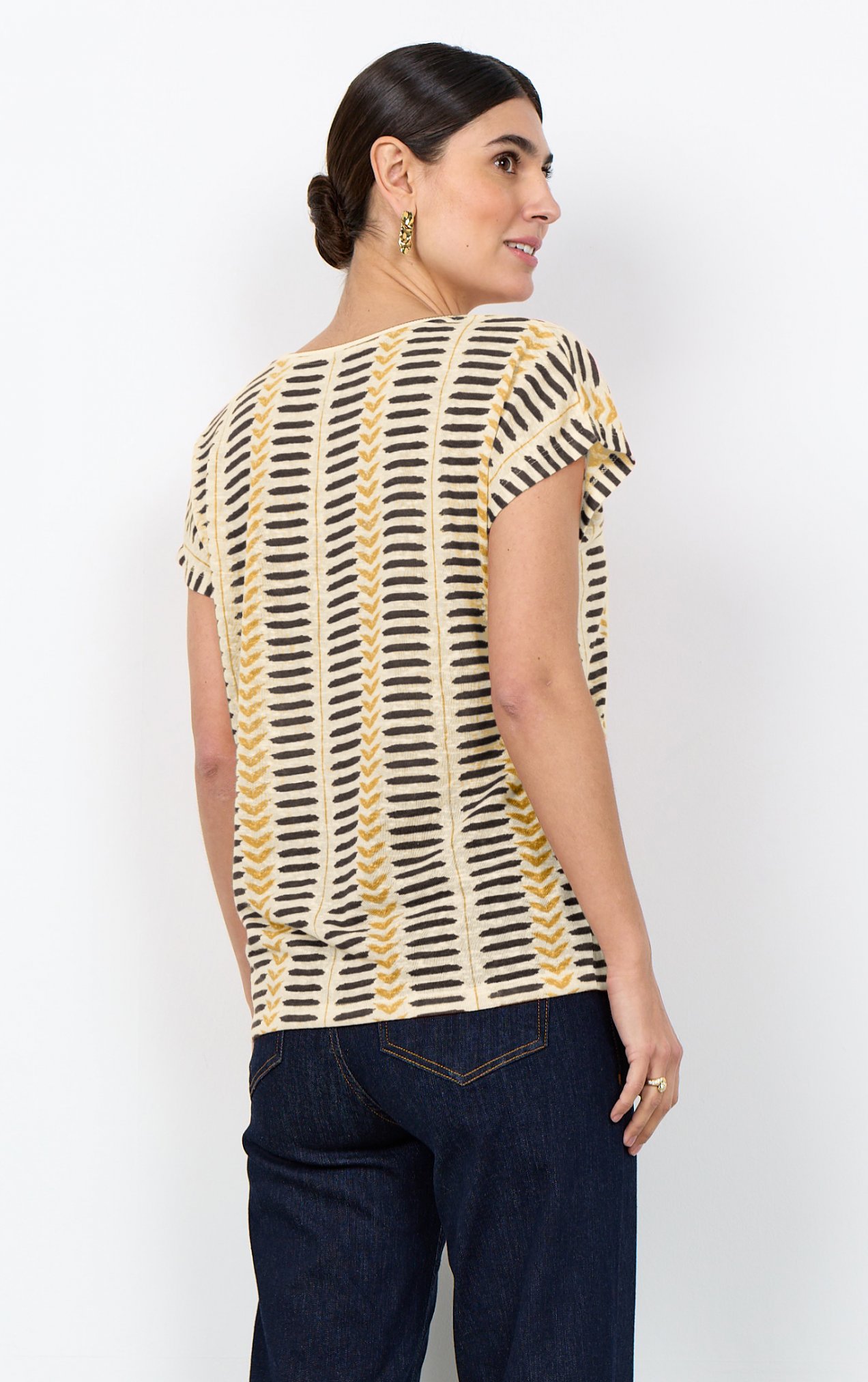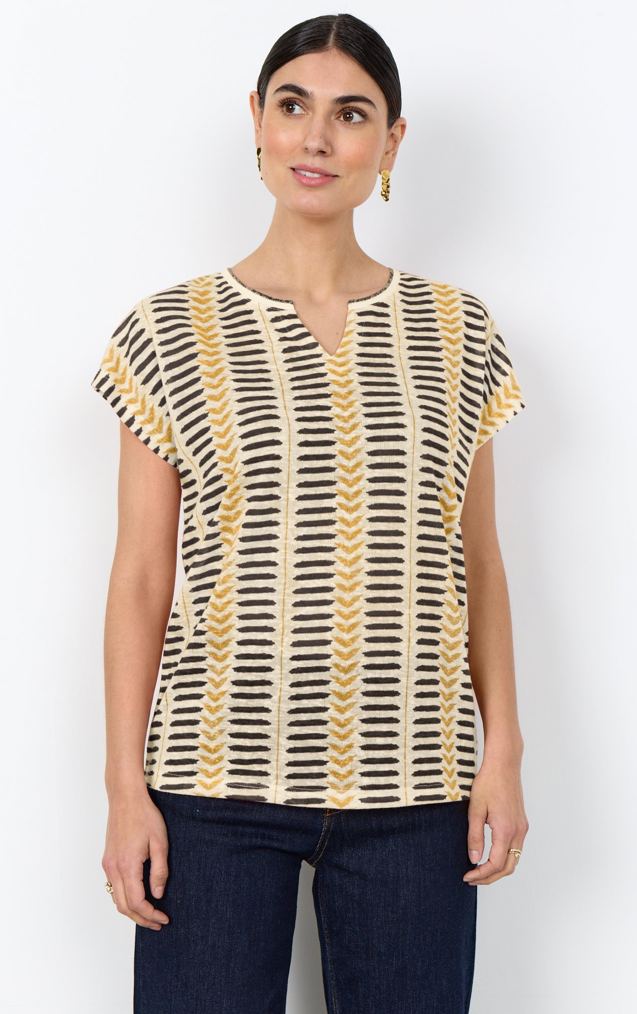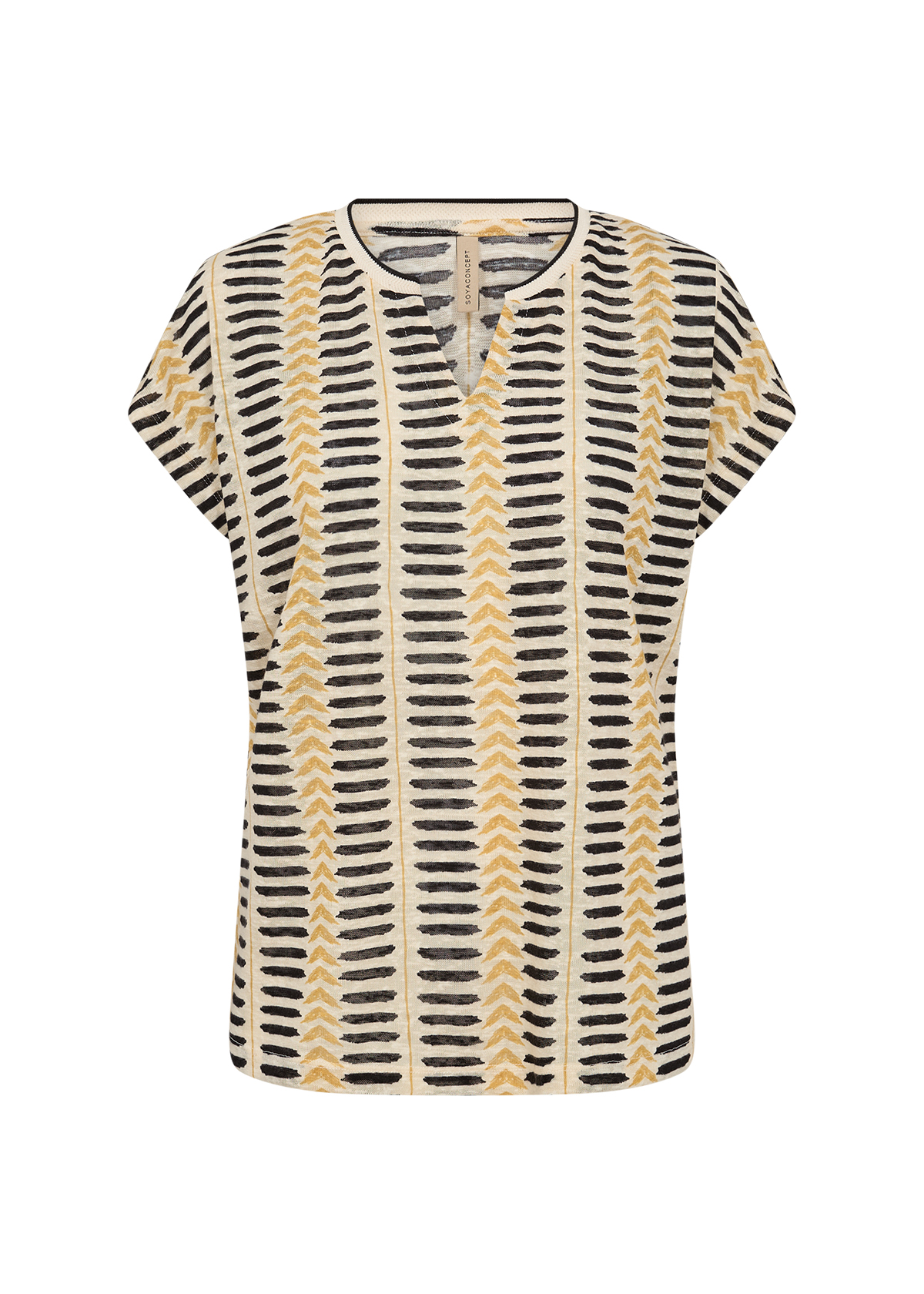 27583 - SC-Aretha 45 från Soya Concept är tillverkad av 100% återvunnen polyester. T-shirten har en klassisk kortärmad design med V-ringning och ett iögonfallande geometriskt tryck. Kombinera den här snygga t-shirten med jeans för en avslappnad look eller stoppa in den i en kjol för något mer raffinerat.
