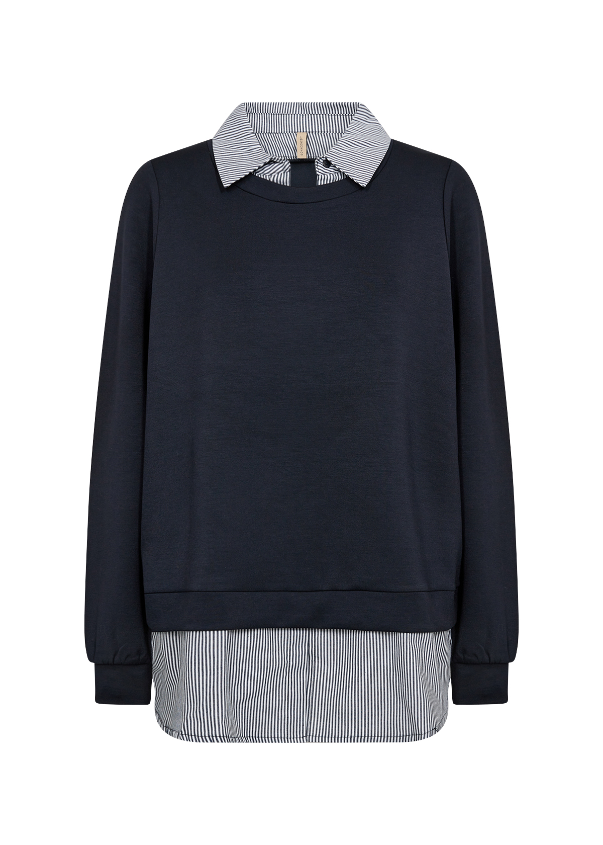 27274 - SC-Banu 264 från Soya Concept är en blus tillverkad av 48% modal, 48% polyester och 4% elastan. Blusen har en snygg randig krage och fåll, långa ärmar och en rund halsringning. Den passar bra till både avslappnade jeans och skräddarsydda byxor för en snygg look.